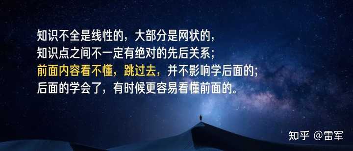 后来我才明白了其中的道理:知识不全是线性的,大部分是网状的,知识点之间不一定有绝对的先后关系;前面内容看不懂,跳过去,并不影响学后面的;后面的学会了,有时候更容易看懂前面的。