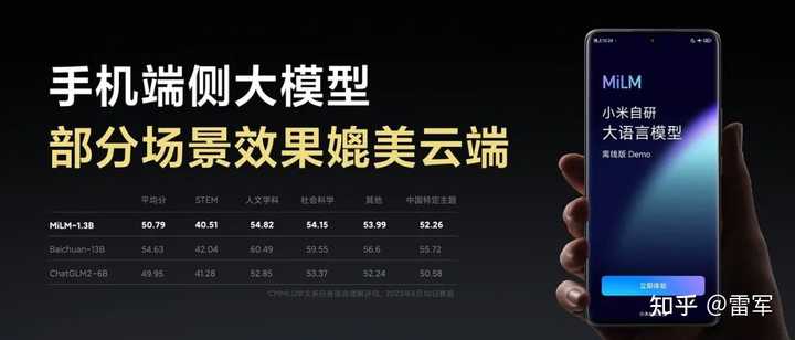 同时,小米积极布局人工智能,全面推进大模型研发和落地,选择“轻量化,本地部署”作为小米大模型技术主力突破方向。在现场,我正式宣布手机端侧大模型初步跑通。此外,小爱同学也升级AI大模型,并开启邀请测试。